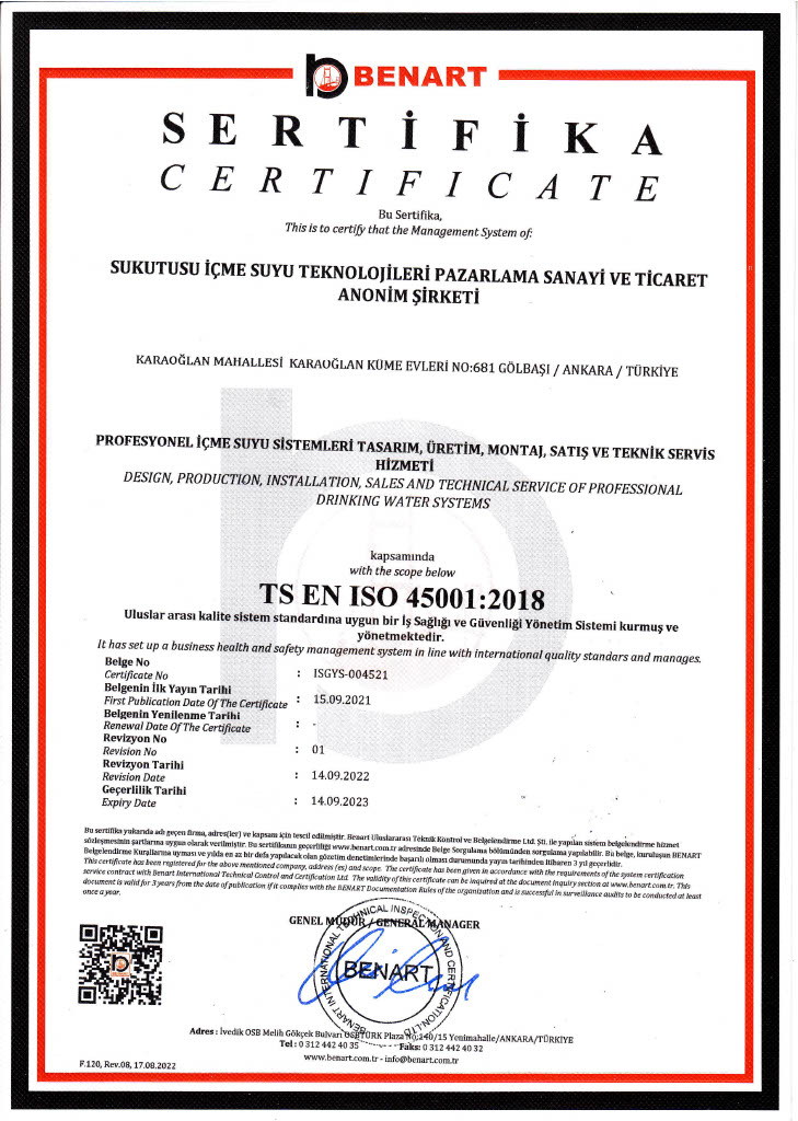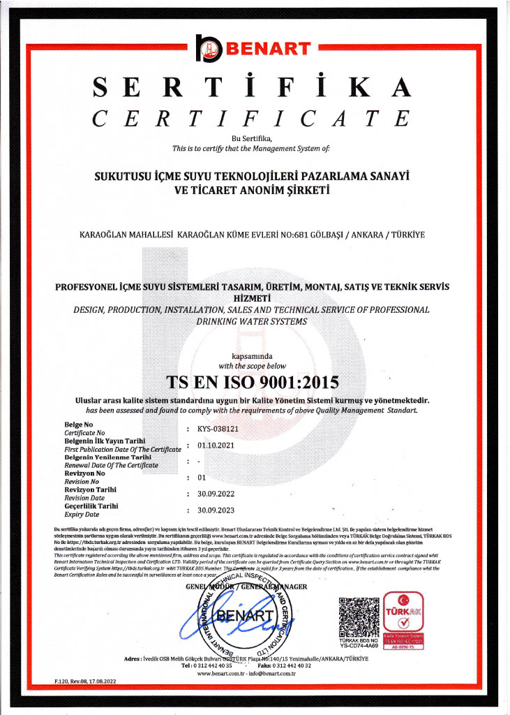 SUKUTUSU A.Ş. was established in 2002 in Ankara with 100% domestic capital with the mission of developing, producing and promoting advanced technology water treatment machines that meet the need for healthy drinking water. Our company, which is not only domestic but also all countries of the world in its target market, started its work by registering the WATERBOX-SUKUTUSU brand.